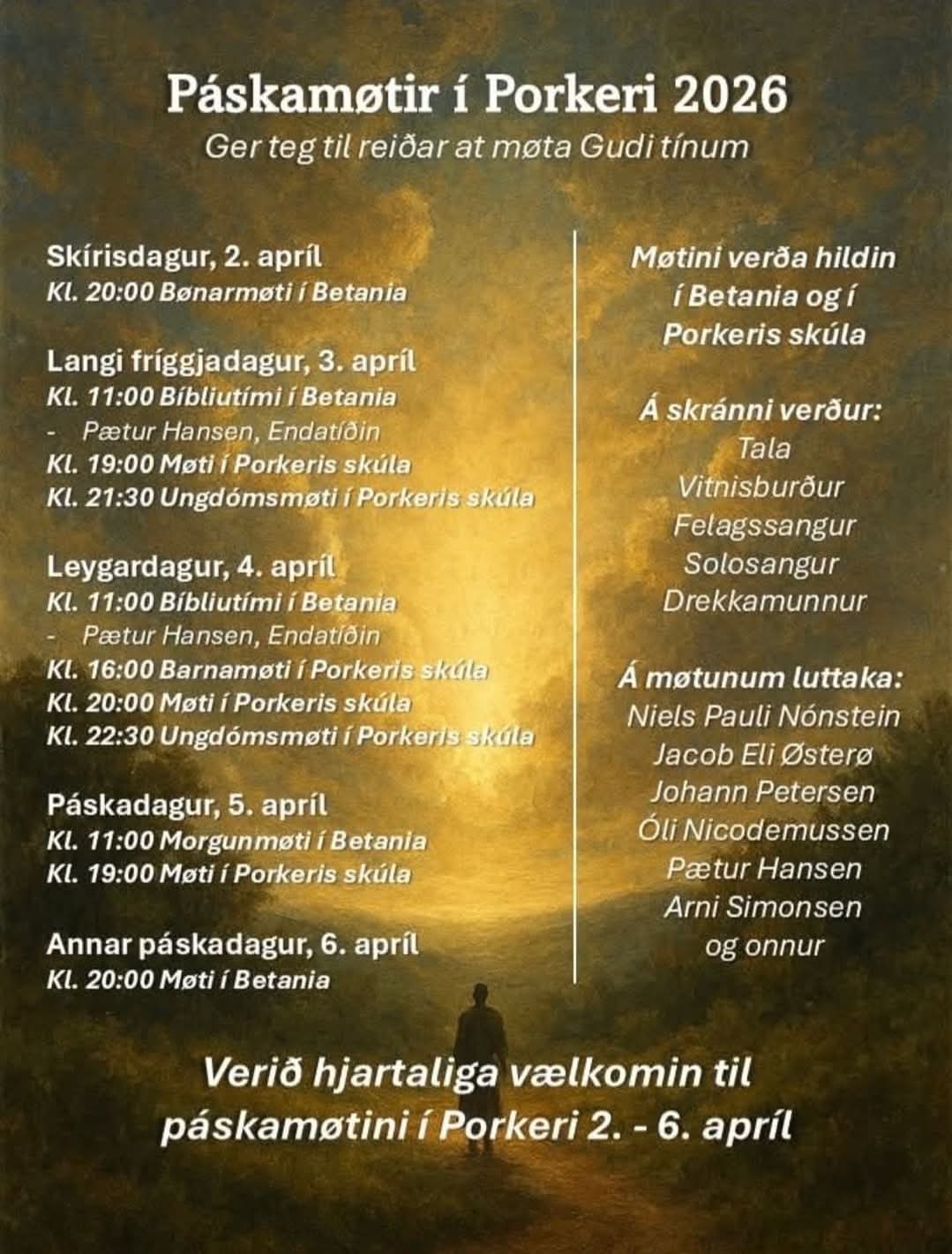 kl. 18 Sunnukvøldsmøti (fyrsta sunnudag í hvørjum mánað)