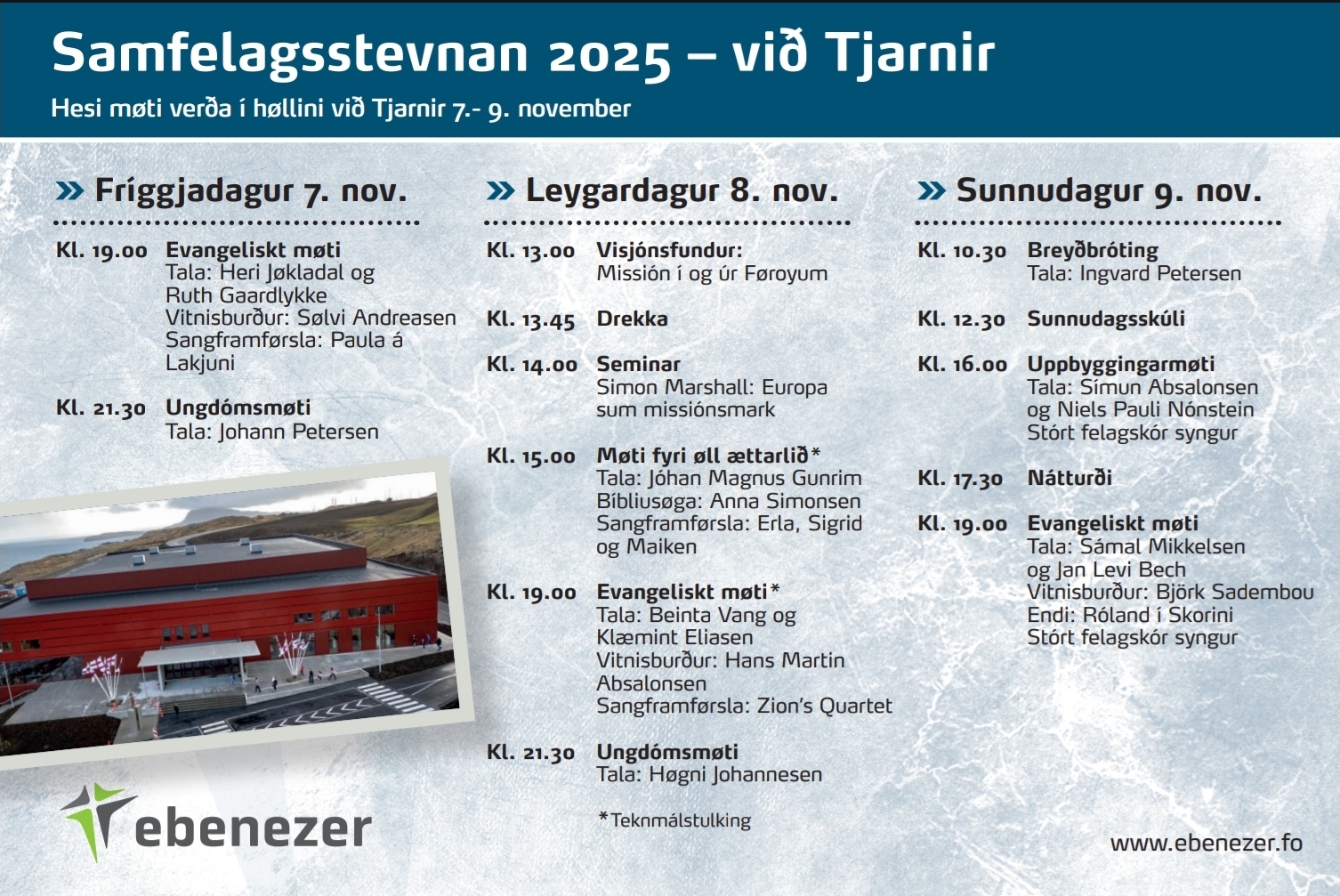 3. nov. 2025 | SamfelagsmøtirVælkomin til Samfelagsstevnua við Tjarnir 7. til 9. november 2025.
